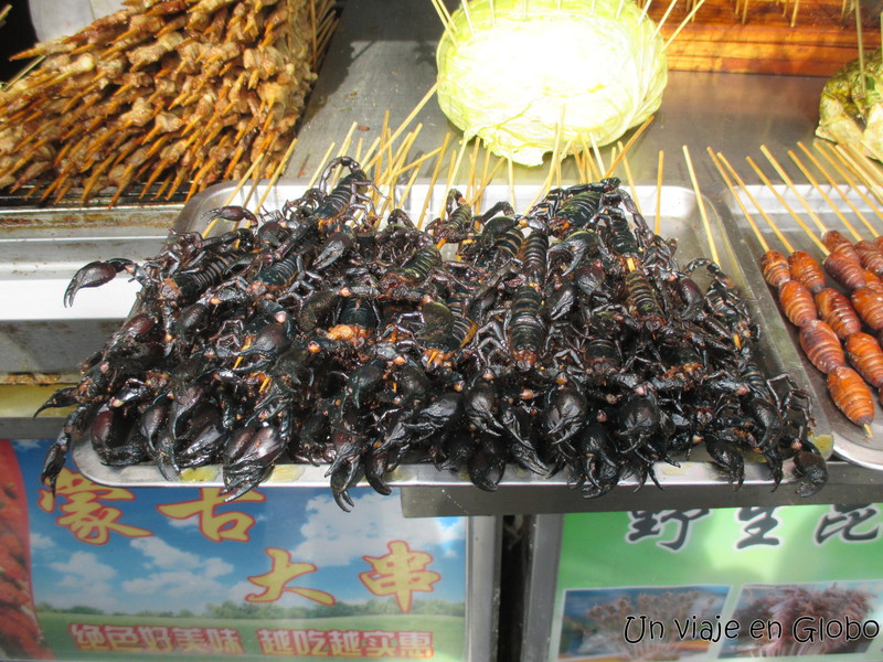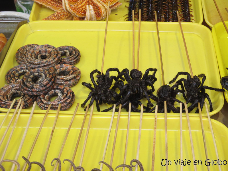 En esta estrecha calle se pueden encontrar las comidas más extrañas, estrellas de mar, caballitos de mar, serpientes, arañas, escorpiones o cucarachas. Por supuesto que nosotros nos limitamos a mirar y tomar fotos, no vimos nada lo suficientemente tentador como para hincar el diente 😅.