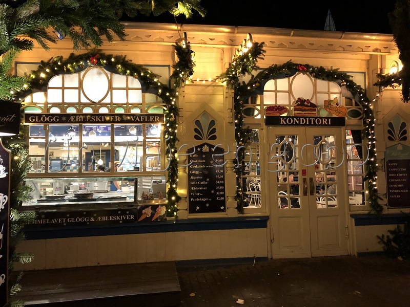 En el parque se monta una pequeña villa decorada con miles de luces de colores, adornos de navidad, puestos de madera que venden las típicas comidas danesas, puestos de dulces y juegos como montañas rusas, trenes y carruseles.