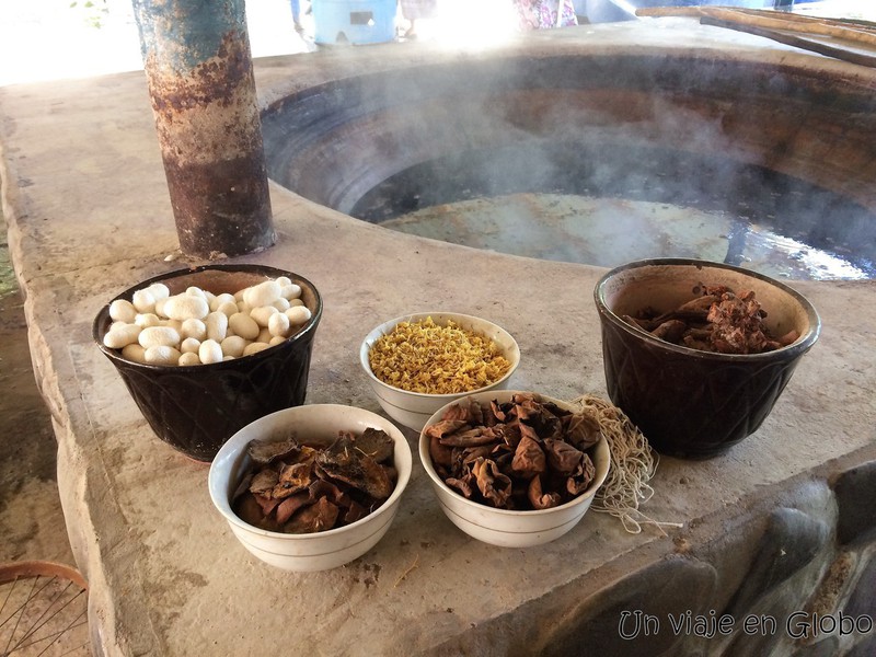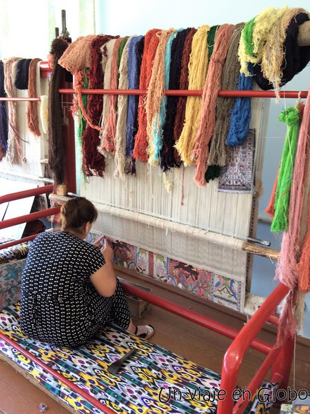 Aquí se fabrica la seda, se la tiñe y finalmente se tejen las alfombras. La visita a la fabrica de alfombras es un imprescindible que ver Uzbekistan, el proceso de fabricación de la seda y tejido de alfombra no ha cambiado mucho por lo que la visita es interesantísima.