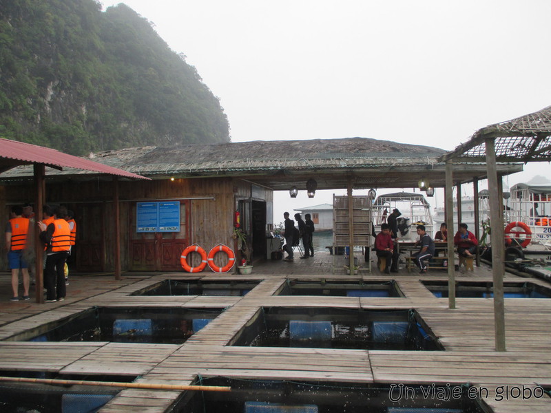 De camino a la cueva Sung Sot atravesamos los famosos pueblos flotantes. Estos pueblos se construyeron inicialmente para que los pescadores pudieran vender la pesca de la noche anterior, pero pronto se empezaron a construir casas, colegios, tiendas y hasta una estación de policía flotante junto con pequeñas piscifactorías. Se dice que desde hace no mucho tiempo el gobierno vietnamita obliga a los residentes de estos pueblos, alguno de ellos viviendo allí desde varias generaciones, a volver a tierra firme para que los niños tengan mejor acceso a la educación y así mejorar la calidad de vida.