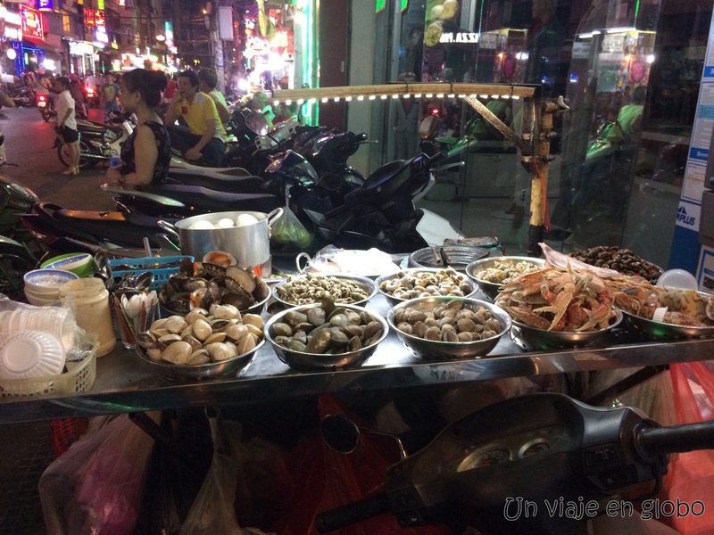 En la calle se ofrecía de todo tipo de pescados y mariscos frescos y cocidos.