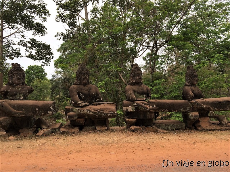 El acceso está flanqueado por 54 estatuas de piedra, dioses con tocados cómicos a la izquierda y demonios con tocados militares a la derecha, en total 108 figuras míticas vigilan cada una de las 5 entradas a la antigua ciudad. Las figuras sostienen una naga (semi dios con forma de serpiente). Al comienzo, la calzada la naga extiende sus 9 cabezas en forma de abanico.