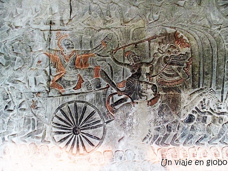 - Galería Sur (Oeste): Procesión del Ejército del rey Suryavarman II. Se ven los 12 elefantes llevando a el rey , también se ve a el rey rodeado de parasoles.